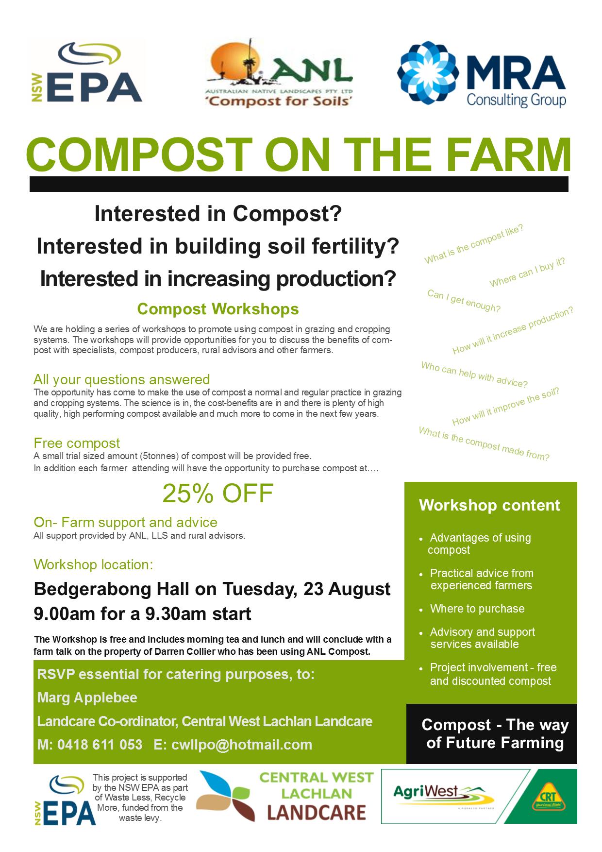 Holding the workshop at Bedgerabong allows the opportunity to see some of the on-ground benefits of the compost at the property of Darren Collier and attendees can speak with him and consultants about application methods, ratios etc. Speakers will also include Roger Crisp from ANL, Virginia Brunton, Organics Consultant from MRA Consulting and Guy Webb from Agriwest.