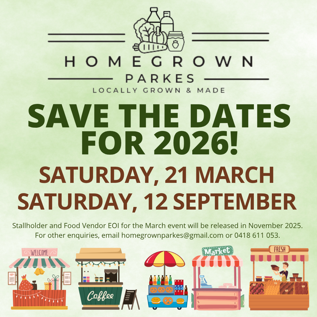 For further information, go to our Homegrown Parkes Facebook or Instagram page.
